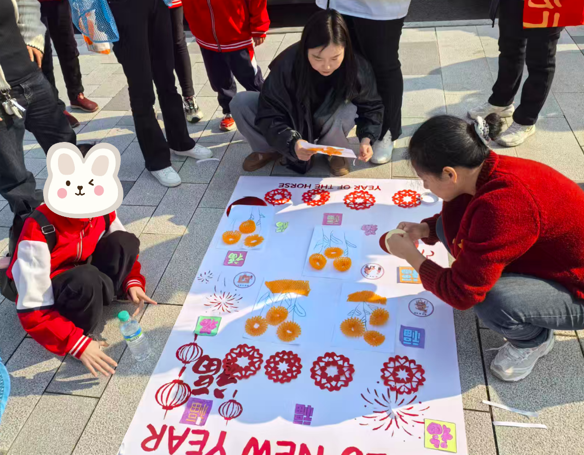 活动伊始,志愿者们早早抵达宋应星雕像广场,协助布置签到点、搬运物资,协助特教老师将年味满满的创意小贴纸分别张贴在三张大纸张上,醒目地放在活动现场。新年习俗贴纸科普着奉新本地扫尘、贴春联的过年讲究;“平安喜乐 健康快乐 时来运转” 贴纸承载着暖心的祝福;“2026马年大吉” 新年创意贴则洋溢着辞旧迎新的喜庆。孩子们围着贴纸好奇驻足,家长们也饶有兴致地品读,浓浓的新年年味在广场上悄然弥漫。