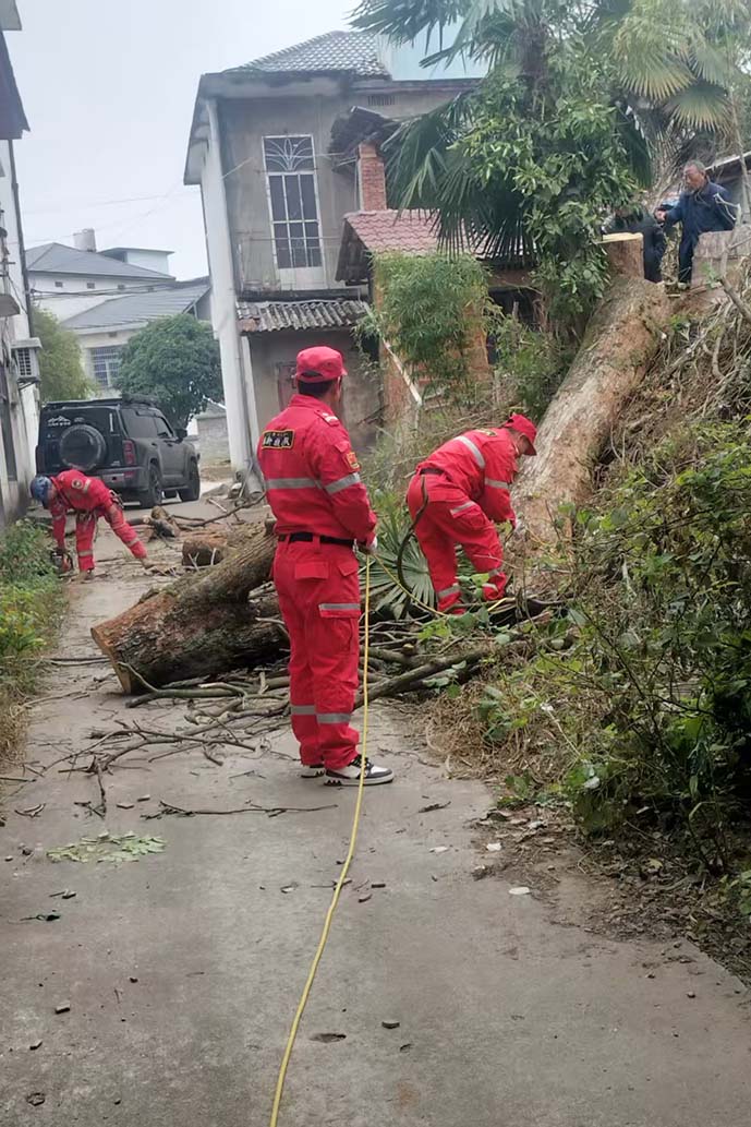 由于树木邻近房屋与电线,作业难度较大。队员们采取牵引控制、分段锯除等方式,精准控制树木倒向。尽管现场锯末纷飞、地势复杂,队员们仍紧密配合:有人专注操作设备,有人观察风向与环境变化,还有人迅速清理障碍。经过三个多小时的持续作业,枯树被安全拆除,现场路段恢复通畅。
