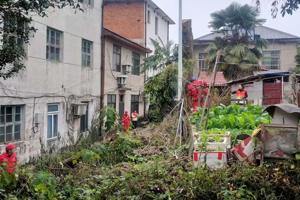 为及时排除险情,救援队迅速响应,于当天下午14时集结队员赶赴现场。作业前,队员对树木周围环境进行细致勘察,并根据树木高度、位置及周边设施分布,制定分段砍伐、定向倾倒的作业方案。队员分为三组:第一组负责现场警戒与疏散引导,确保作业区无闲杂人员;第二组使用油锯、手锯等工具实施专业砍伐;第三组则随时清理倒伏树木及断枝,保障道路畅通。